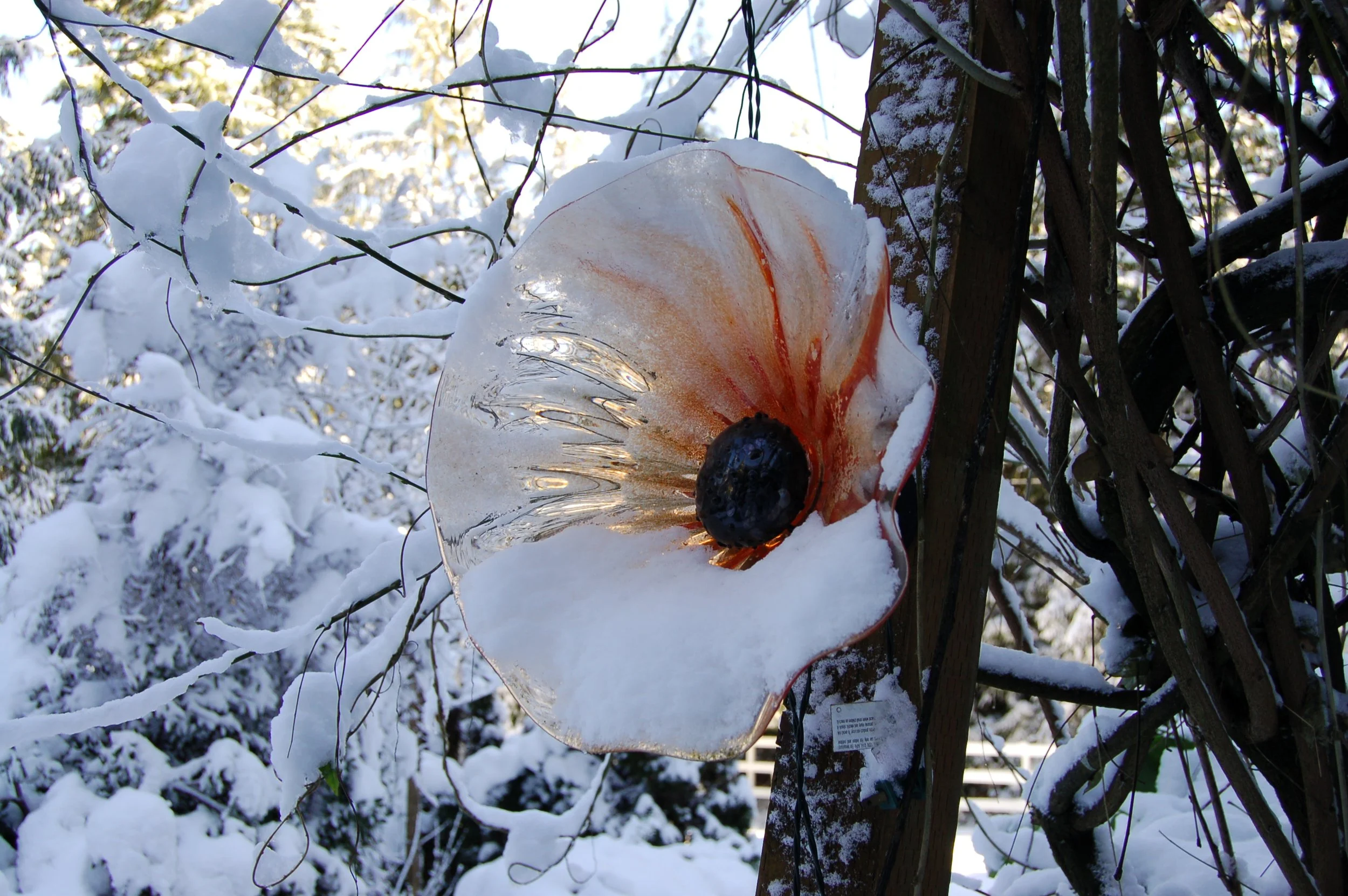 Our glass Icicles, Fiddlesticks, Glacicles, Birds, Poppies and Unicorn Horns are designed for year round weather. Our Poppies can be kept outside as long as they are displayed at an angle so water will not collect and freeze inside the flower.